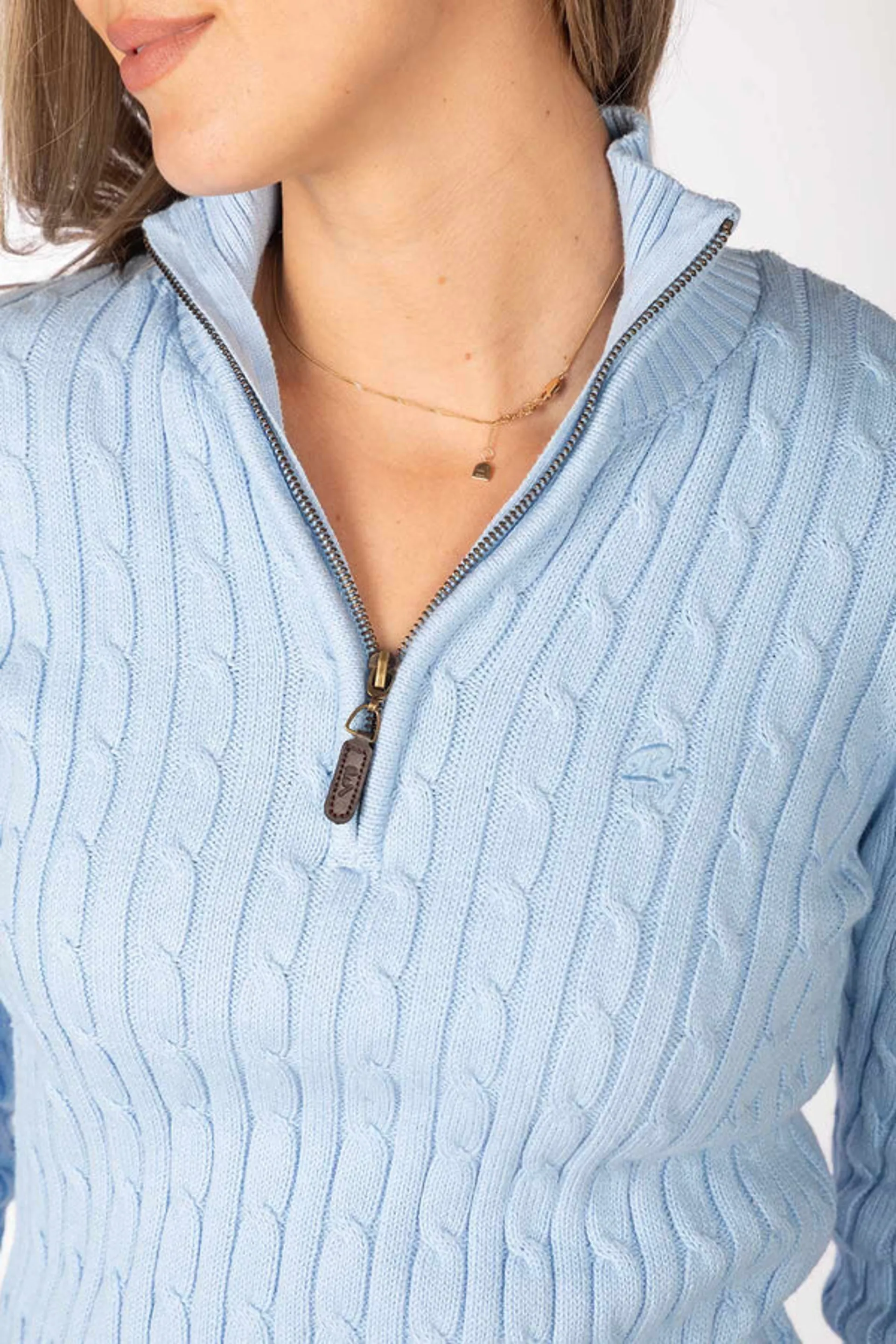 Rydale Ladies Emma Quarter Zip Cable Knit Jumper Soft Blue