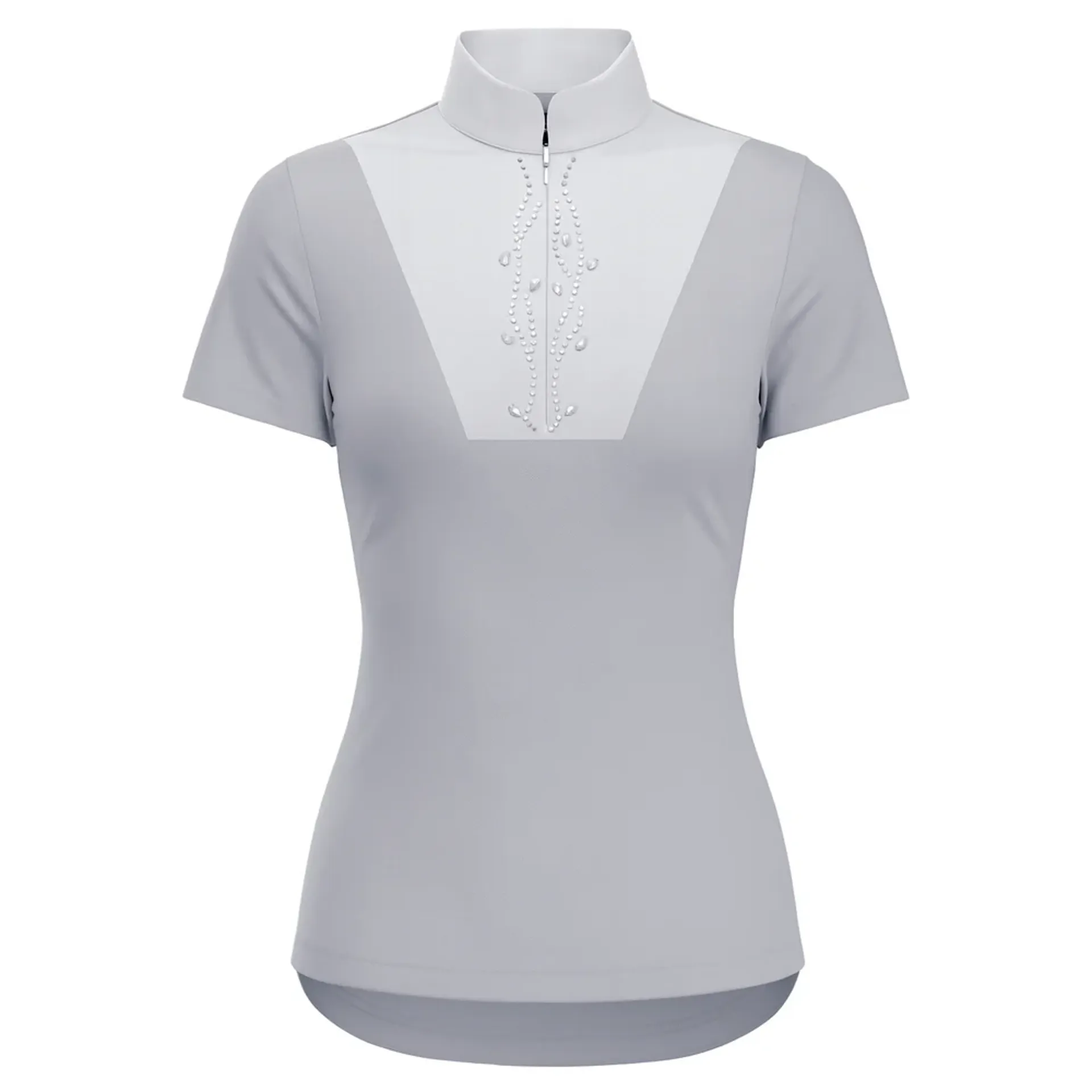 The shirt's distinctive design includes a white contrast bib, adding a traditional competition look with a twist. Delicate crystal embellishments adorn the bib in an elegant pattern, catching the light as you move and giving just the right amount of sparkle for the show ring. This subtle touch of glamour ensures the Virginia Shirt stands out while still adhering to the smart, professional image required in competition settings.