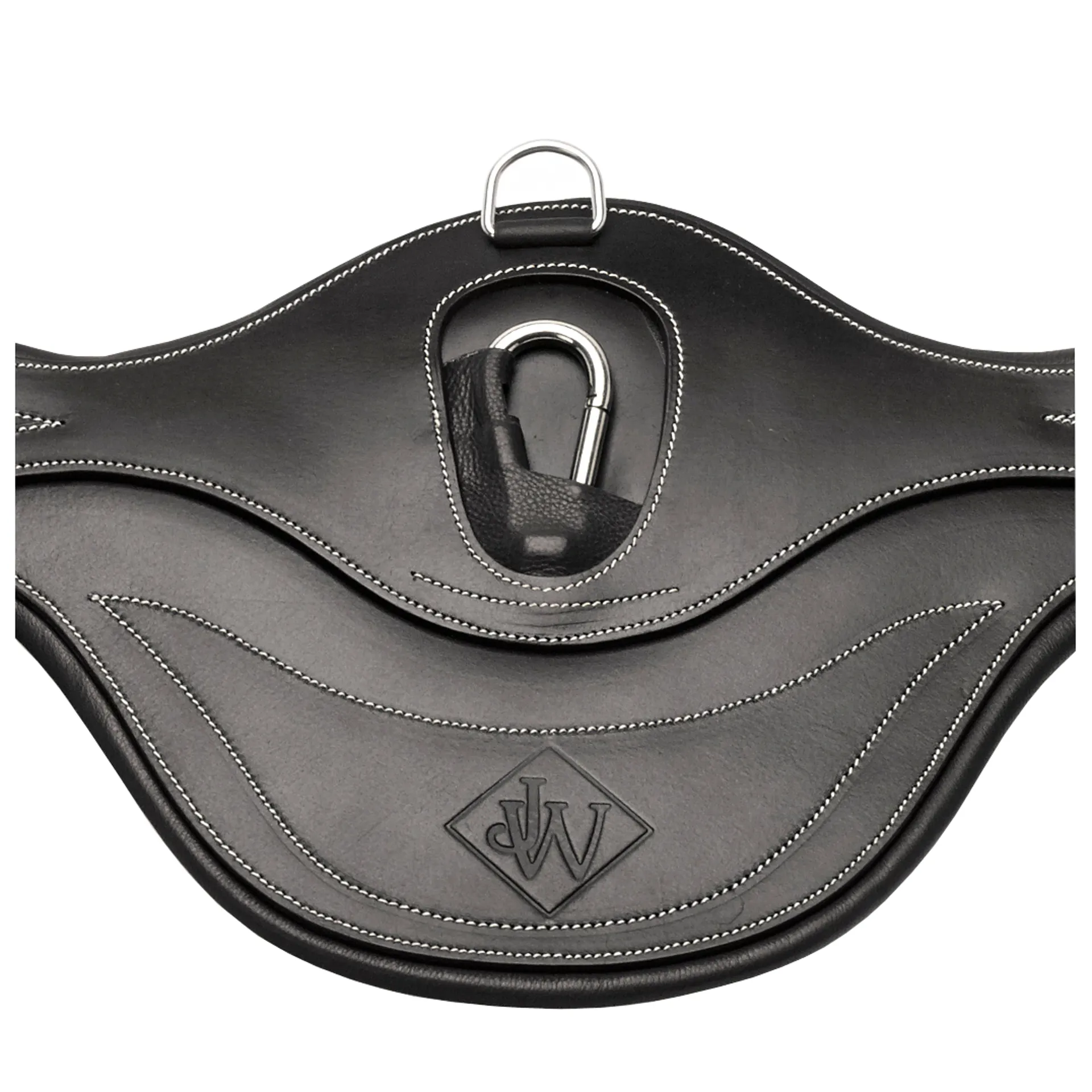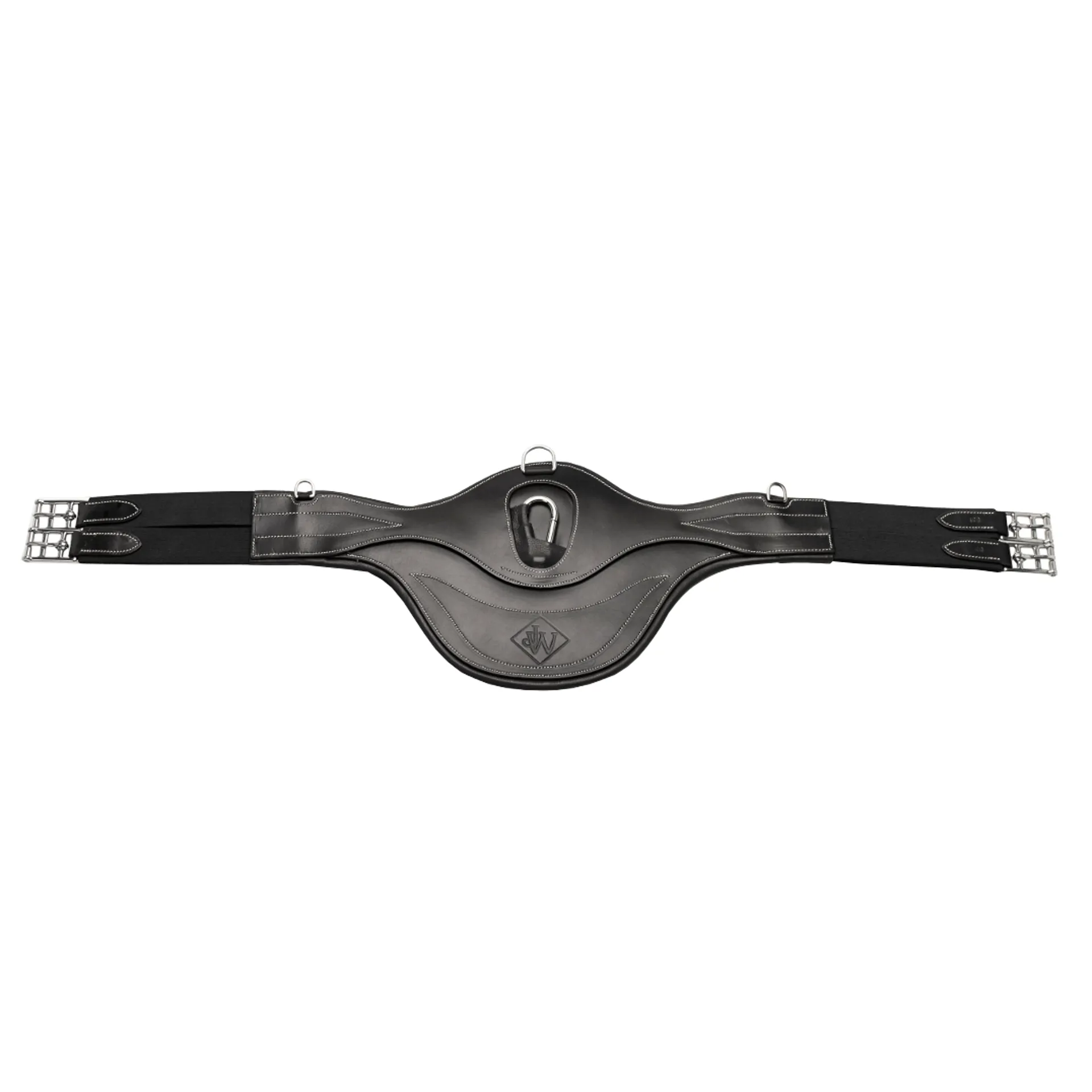 It has a strap for the martingale attachment, side 'd' rings for the use of side or draw reins and has elastic inserts at both ends.